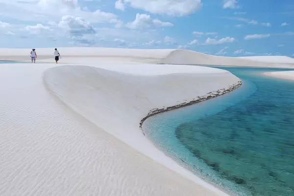 简直是世界上最美丽的沙漠!令人难以置信荒凉的沙漠竟然有清澈的蓝色湖水!来到巴西的北部海滨地区马拉赫塞斯,仿佛进入了另一个空间。由白色沙丘和蓝色咸水湖组成的巴西拉克依斯马拉赫塞斯国家公园有着世界上独一无二的美丽景色。一座座充满魔幻色彩的半月形的沙丘,一波波闪着微光的白色沙浪绵延铺展。雨水汇集成的耀眼的蓝绿色池塘中,游着银光闪闪的鱼群。雨季过后的6月到7月,就会有满满的湖水,最适合这个时候去!